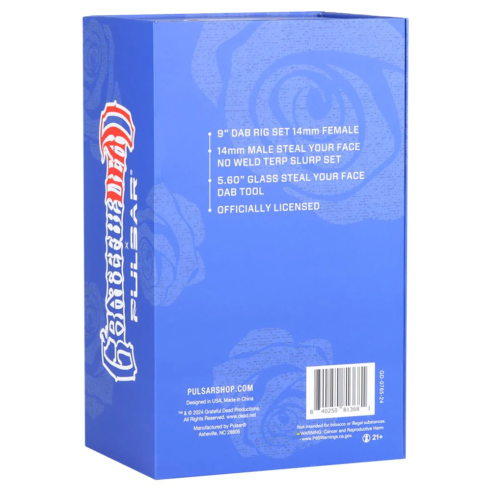 Introducing the Grateful Dead x Pulsar Stealied Out Dab Rig Set - 9" / 14mm F, a must-have piece for both collectors and dabbing enthusiasts. This eye-catching rig stands tall at 9 inches, showcasing the iconic āSteal Your Faceā design that pays homage to the legendary Grateful Dead. It's not just about function; itās also a celebration of music culture and style that you can display proudly.